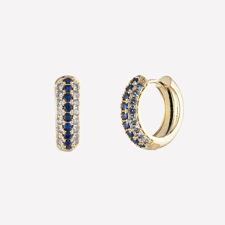 Sparkling huggie hoop earrings featuring red or blue pavé-set crystals that create continuous shimmer. The huggie style provides security and comfort, whilst the pavé setting maximizes sparkle.