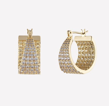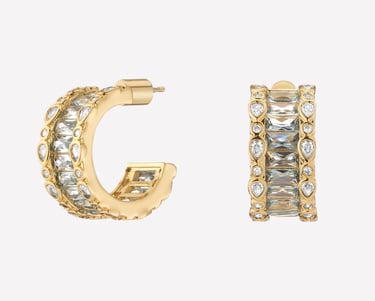 Crafted from sustainable brass and adorned with Swarovski crystals, these hoops come in 18kt gold finishes, representing everyday luxury, beautifully redefined. The one-inch diameter provides presence without overwhelming.